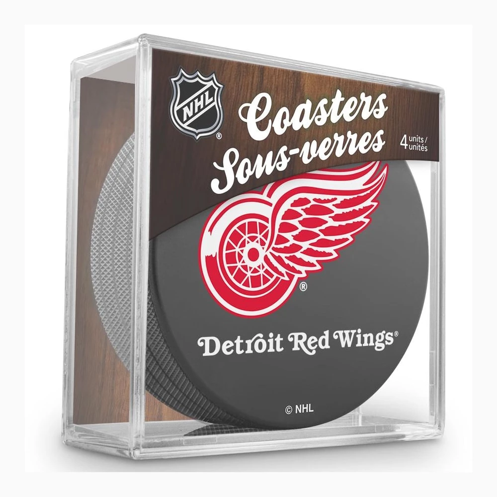 Calling all Detroit Red Wings fans, the next addition to your bar or party set should be these puck coasters. Not only is this perfect for your home but it’s a great item to bring to the office or college! The set of 4 coasters is 3 inches in diameter, each of the coasters is illustrating the team’s respective souvenir puck design (basic, stitch, autograph & retro). The set is sold in a cube and is an Officially Licensed NHL product.