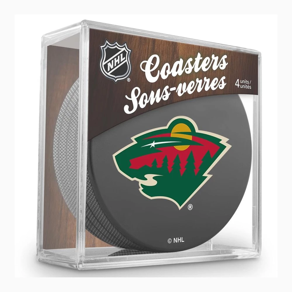 Calling all Minnesota Wild fans, the next addition to your bar or party set should be these puck coasters. Not only is this perfect for your home but it’s a great item to bring to the office or college! The set of 4 coasters is 3 inches in diameter, each of the coasters is illustrating the team’s respective souvenir puck design (basic, stitch, autograph & retro). The set is sold in a cube and is an Officially Licensed NHL product.
