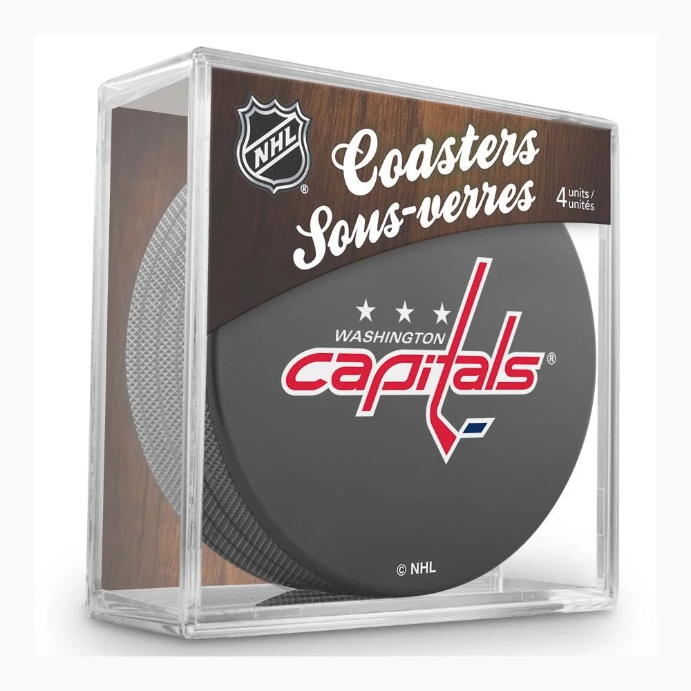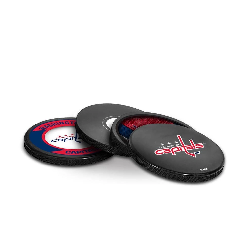 Calling all Washington Capitals fans, the next addition to your bar or party set should be these puck coasters. Not only is this perfect for your home but it’s a great item to bring to the office or college! The set of 4 coasters is 3 inches in diameter, each of the coasters is illustrating the team’s respective souvenir puck design (basic, stitch, autograph & retro). The set is sold in a cube and is an Officially Licensed NHL product.